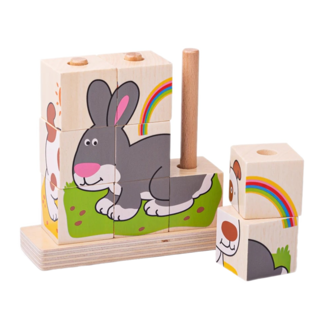 Stapelblokken in het thema huisdieren met een poes, een hond, een hamster, een konijn enzovoort. Een basis met 9 grote blokken. Hoogte 14 cm. Leeftijd 2+.