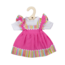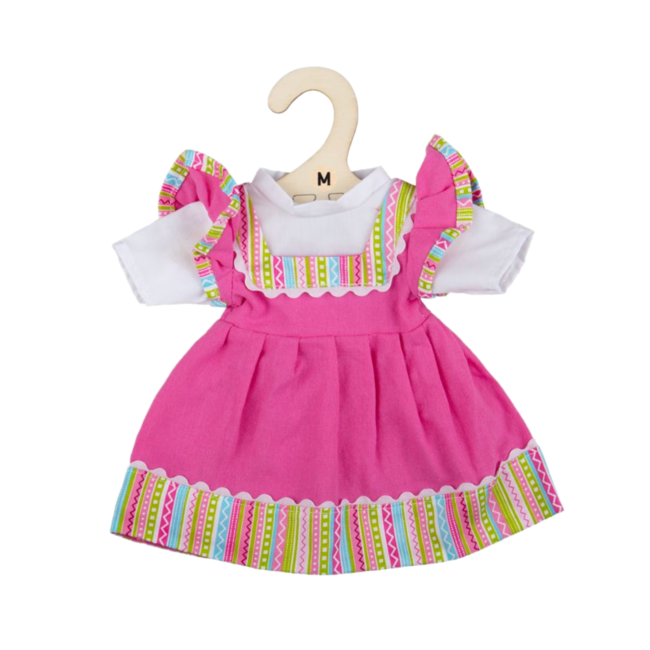 Roze jurkje met regenboog steepjes voor de 30 cm poppen van het merk Bigjigs.