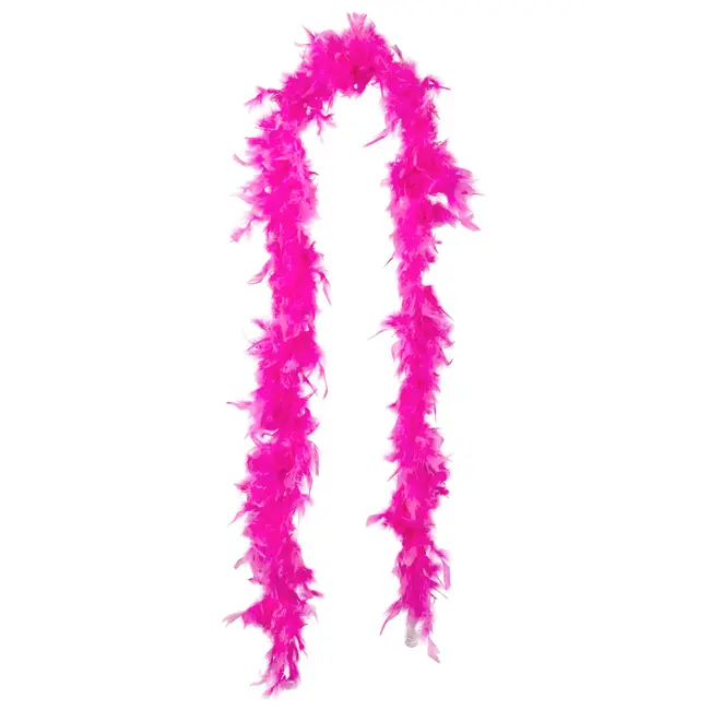 De boa is uitgevoerd in een fel roze kleur die direct opvalt. Met een lengte van bijna twee meter kun je de veren sjaal ruim om je schouders slaan. De veren zitten aan een stevig koord vast zodat de sjaal goed in model blijft tijdens het dragen. Het is een lichtgewicht toevoeging die je niet hindert bij het dansen of bewegen. Een mooie aanvulling voor een themafeest of een optreden.