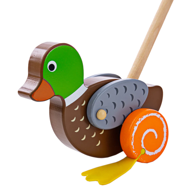 Deze vrolijke houten duwstok in de vorm van een eend maakt lopen nog leuker voor nieuwsgierige peuters. Terwijl je kindje hem voortduwt, flapperen de pootjes vrolijk over de vloer! Lees meer.