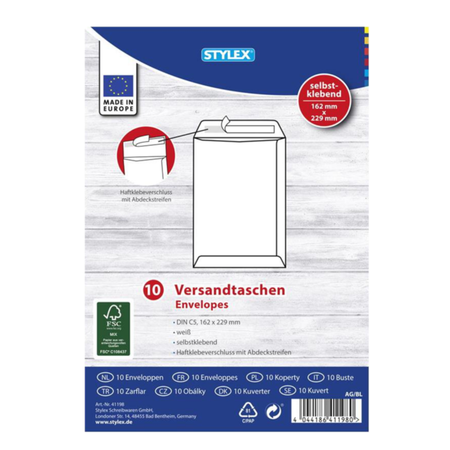 Praktische set van 10 witte enveloppen van Stylex in C5 formaat, ideaal voor het versturen van documenten of grotere kaarten. Dankzij de zelfklevende plakrand zijn ze snel en eenvoudig te sluiten.