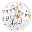 De ballon heeft een witte basis met de tekst Welcome Home in grote letters. Boven de letters hangen vrolijke vlaggetjes in kleuren zoals oranje, groen en paars. Ook staan er sterren en goudkleurige stippen op de versiering. Je kunt de ballon vullen met gewone lucht via een rietje of kiezen voor helium zodat hij blijft zweven. Het stevige materiaal zorgt ervoor dat de ballon lang goed blijft.