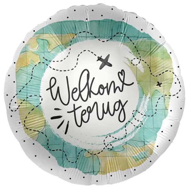 Verras een reiziger bij thuiskomst met deze sfeervolle folieballon van Premioloon. Met de tekst welkom terug op een achtergrond van een wereldkaart is dit de perfecte versiering voor iemand die terugkomt van een verre reis of vakantie.
