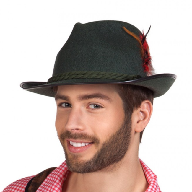 Een donkergroene Tiroler hoed met sierveren, perfect voor Oktoberfest, Duitse themadagen of een verkleedmoment in Alpenstijl.
