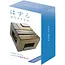 Dit ontwerp lijkt op een massief blokje met een gat in het midden. In werkelijkheid zijn het twee stukken die als een spiraal in elkaar zitten. De hoekige vormen maken het lastig om de juiste draai te vinden. De bronzen en donkergrijze kleuren geven de puzzel een stoere uitstraling. Het metaal voelt zwaar aan en de doos is twaalf bij acht centimeter groot. Alles weer in de juiste vorm krijgen is een flinke klus.