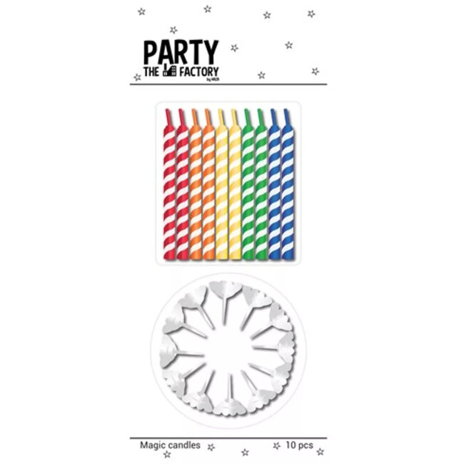 In deze set vind je tien vrolijk gekleurde kaarsjes die speciaal zijn gemaakt als taartdecoratie. Het lijkt in eerste instantie een heel gewone versiering, maar de truc zorgt gegarandeerd voor gegiechel en verbaasde gezichten aan tafel. Steek ze aan, wacht ongeveer twee minuten, en laat de jarige vervolgens blazen. Zodra de vlammetjes gedoofd lijken, vlammen ze doodleuk weer op. Met de meegeleverde houdertjes prik je ze bovendien veilig en stevig in het gebak.