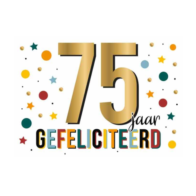 Artige wenskaart uit de serie Daisy. Op deze kaart staat de tekst: '75 Jaar, gefeliciteerd'. Met extra glans en een gouden envelop geeft deze kaart en luxe uitstraling. Lees meer.