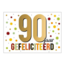 Op de voorkant van de kaart prijkt een grote negentig in een goudachtige kleur, omringd door vrolijk gekleurde stervormige figuurtjes en stippen in onder andere rood, oranje, groen en geel op een lichte achtergrond. Het woord gefeliciteerd is speels opgemaakt met grote, kleurrijke blokletters. Je kunt deze kaart voorzien van een persoonlijke tekst en hem per post versturen of direct bij een presentje overhandigen.