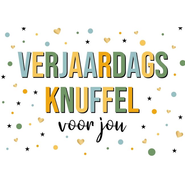 Een vrolijke kaart uit de Daisy-serie met de tekst ‘Verjaardagsknuffel voor jou’. Met een speels design en glanzende accenten is dit een warme manier om iemand op hun verjaardag te verrassen.