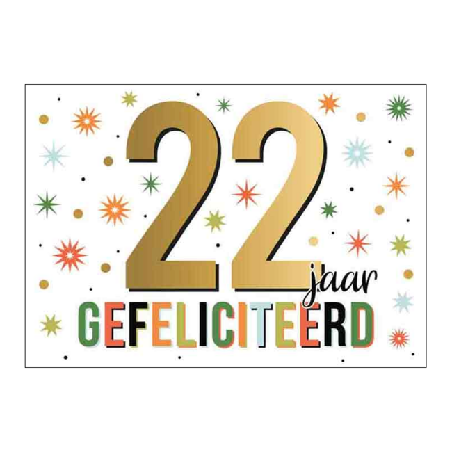 Op de voorkant van de kaart prijkt een grote tweeëntwintig in een goudachtige kleur, omringd door gekleurde sterachtige figuren en stippen op een lichte achtergrond. Het woord gefeliciteerd is speels opgemaakt met grote, kleurrijke blokletters. Je kunt deze kaart voorzien van een persoonlijke tekst en hem per post versturen of direct bij een presentje overhandigen.