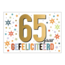 Op de voorkant van de kaart prijkt een grote vijfenzestig in een goudachtige kleur, omringd door vrolijk gekleurde sterren, vierkantjes en stippen op een lichte achtergrond. Het woord gefeliciteerd is speels opgemaakt met grote, kleurrijke blokletters. Je kunt deze kaart voorzien van een persoonlijke tekst en hem per post versturen of direct bij een presentje overhandigen.