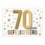 Op de voorkant van de kaart prijkt een grote zeventig in een goudachtige kleur, omringd door gekleurde sterachtige figuren en stippen in onder andere groen, oranje en blauw op een lichte achtergrond. Het woord gefeliciteerd is speels opgemaakt met grote, kleurrijke blokletters. Je kunt deze kaart voorzien van een persoonlijke tekst en hem per post versturen of direct bij een presentje overhandigen.