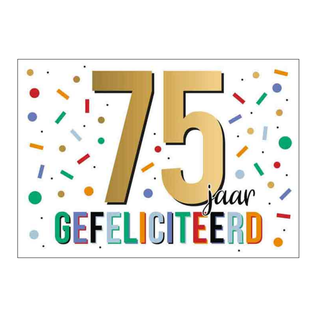 Op de voorkant van de kaart prijkt een grote vijfenzeventig in een goudachtige kleur, omringd door vrolijk gekleurde streepjes en stippen in onder andere rood, blauw, groen en oranje op een lichte achtergrond. Het woord gefeliciteerd is speels opgemaakt met grote, kleurrijke blokletters. Je kunt deze kaart voorzien van een persoonlijke tekst en hem per post versturen of direct bij een presentje overhandigen.