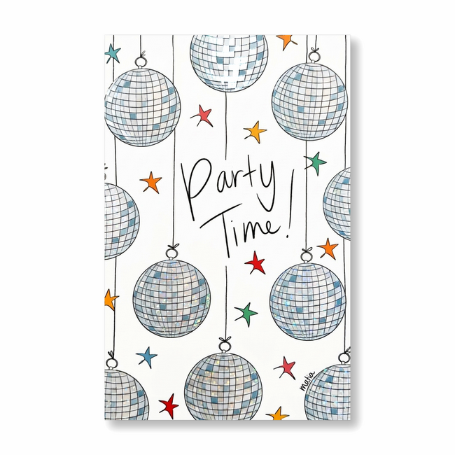 Op de witte voorzijde zie je een patroon van zilveren discoballen die aan lange lijnen hangen. Kleine gekleurde sterretjes in rood, blauw, groen en oranje dansen tussen de ballen door. De tekst Party Time staat midden op de kaart geschreven. De binnenkant is leeg voor een eigen bericht. Met de witte envelop stuur je deze kaart makkelijk op naar de jarige of die ene dansliefhebber.