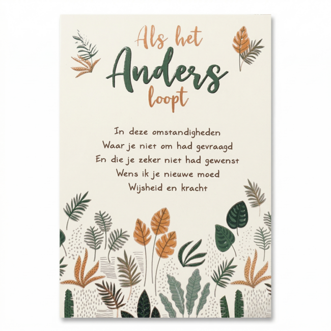 Deze kaart heeft als voorkant de mooie tekst: 'Als het anders loopt. In deze omstandigheden waar je niet om had gevraagd en die je zeker niet had gewenst, wens ik je nieuwe moed, wijsheid en kracht.'