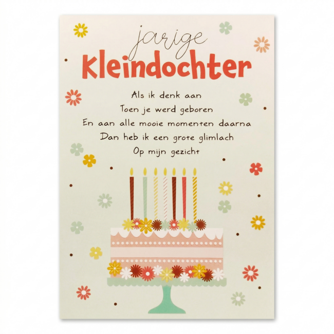 Deze kaart heeft als voorkant de mooie tekst: 'Jarige kleindochter. Als ik denk aan toen je werd geboren en aan alle mooie momenten daarna, dan heb ik een grote glimlach op mijn gezicht.' Lees meer.