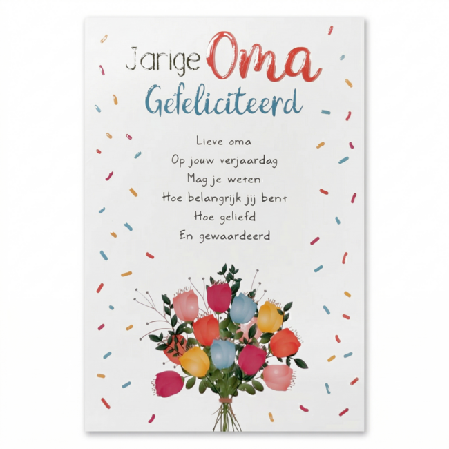 • Voorzijde: ‘Jarige oma, gefeliciteerd. Lieve oma, op jouw verjaardag mag je weten hoe belangrijk jij bent, hoe geliefd en gewaardeerd.’