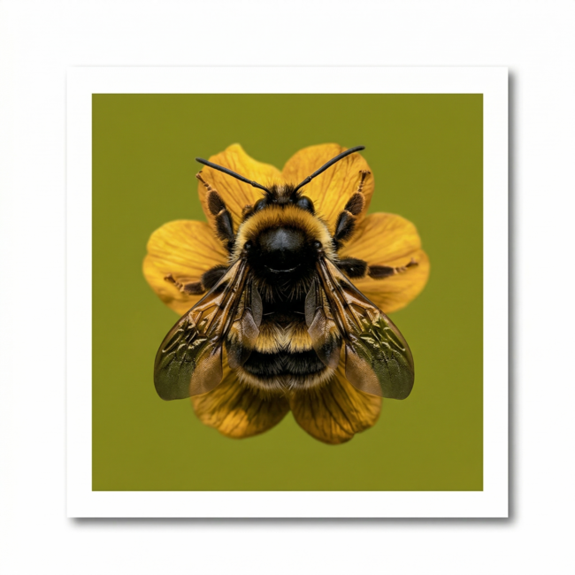 Deze vierkante kaart heeft een witte rand die de natuurfoto mooi omlijst. Op de afbeelding zie je een close-up van een pluizige hommel die precies in het hart van een gele bloem zit tegen een groene achtergrond. Omdat de binnenkant blanco is heb je alle ruimte voor een eigen tekst. De stevige gevouwen kaart komt met een luxe zilverkleurige envelop die de post extra speciaal maakt. Het is een prachtig gebaar voor de ontvanger.