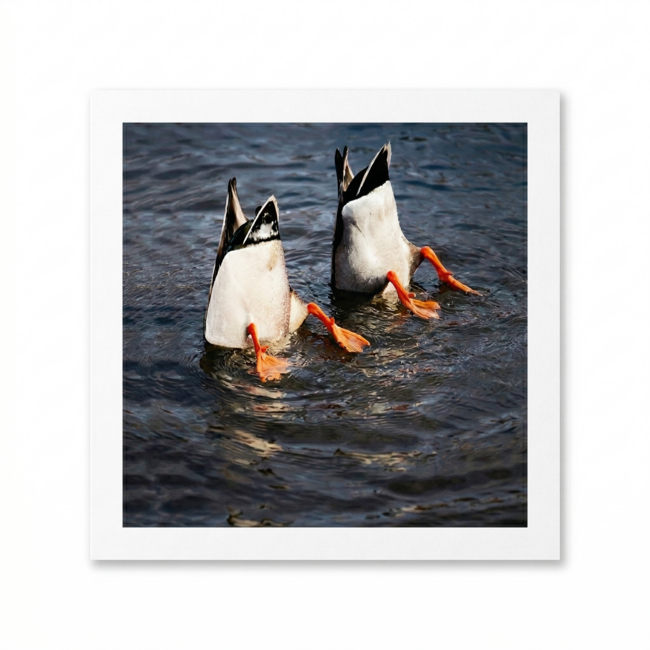 Deze vierkante kaart heeft een witte rand die de natuurfoto mooi omlijst. Op de afbeelding zie je twee eenden die met hun kop onder water staan, waardoor alleen hun staarten en oranje poten boven het donkere water uitsteken. Omdat de binnenkant blanco is heb je alle ruimte voor een eigen tekst. De stevige gevouwen kaart komt met een luxe zilverkleurige envelop die de post extra speciaal maakt. Het is een grappig gebaar voor de ontvanger.