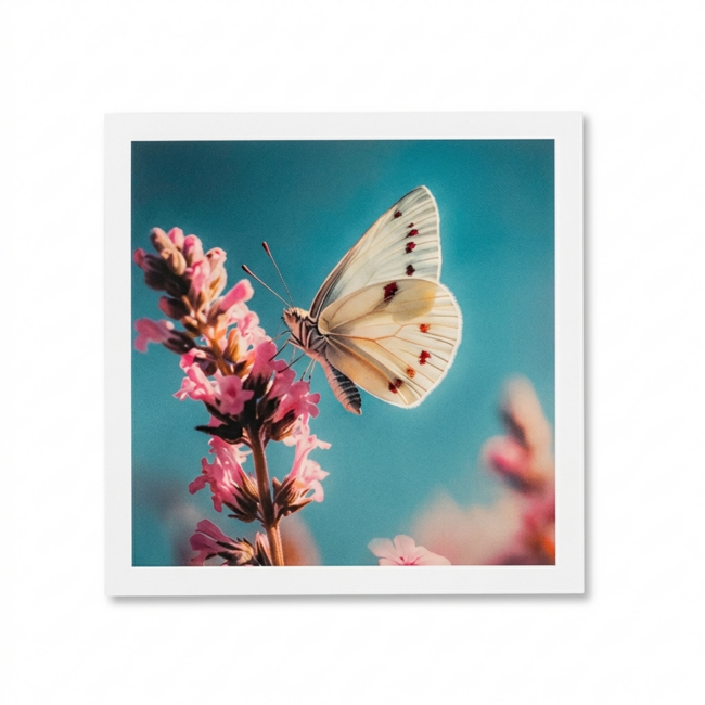 Deze vierkante kaart heeft een stijlvolle witte rand die de natuurfoto mooi omlijst. Op de afbeelding zie je een witte vlinder met rode stippen die op roze bloemen rust tegen een heldere blauwe achtergrond. Omdat de binnenkant blanco is heb je alle ruimte voor een persoonlijke tekst. De stevige gevouwen kaart wordt geleverd met een luxe zilverkleurige envelop die de post extra feestelijk maakt. Het is een tastbaar gebaar dat zeker gewaardeerd wordt door de ontvanger.