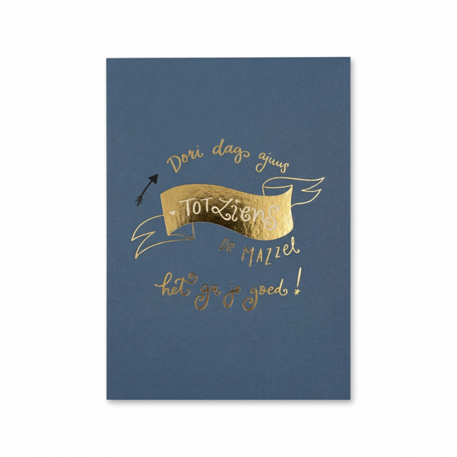 Deze dubbele kaart heeft een stoere donkerblauwe kleur. De combinatie van het gouden lint en de verschillende goudkleurige lettertypes geeft het geheel een luxe uitstraling. Op de voorkant staan diverse groeten zoals tot ziens en de mazzel. Binnenin is de kaart leeg gelaten voor je eigen tekst. Je krijgt er een passende envelop bij zodat je de post direct kunt versturen naar de persoon die weggaat.