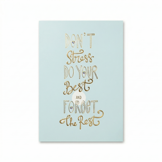 Deze kaart heeft een rustige lichtblauwe kleur die goed past bij de kalmerende boodschap. De sierlijke gouden letters liggen wat op het papier en geven de kaart een mooie uitstraling. Door de fonkelende steentjes valt de tekst extra goed op. Binnenin is er voldoende ruimte voor een eigen tekst. Het is een staand model dat wordt geleverd met een passende envelop. Zo stuur je eenvoudig een klein steuntje in de rug via de post.