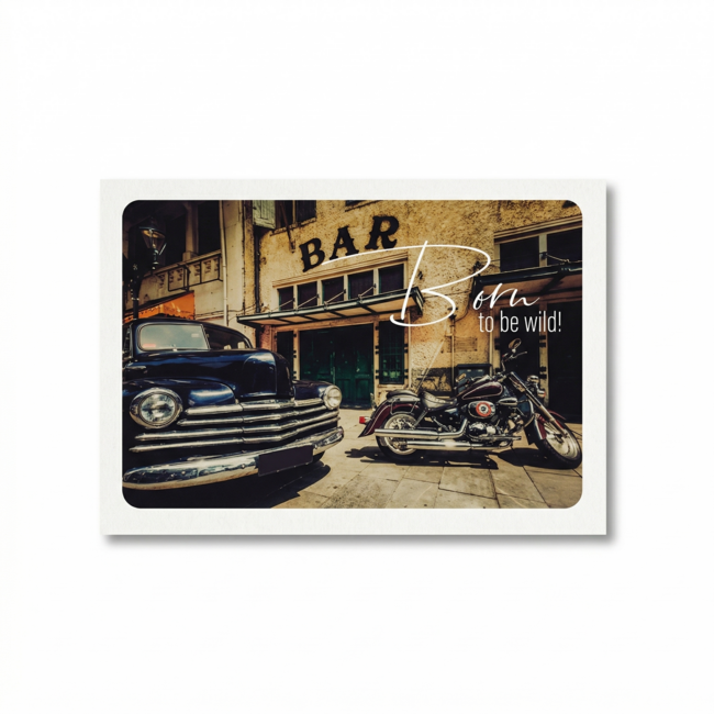 Verras iemand met deze stoere kaart van Paperclip Cards uit de Photo Factory serie. Op de foto zie je een klassieke auto en een motor voor een bar staan met de tekst Born to be wild. Een ideale wenskaart voor een avontuurlijk type.