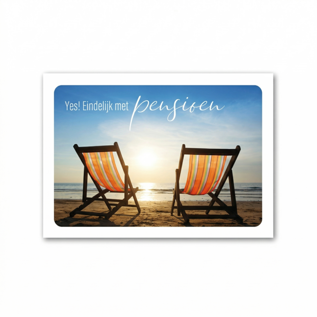 Wens iemand een heerlijke tijd toe met deze pensioenkaart van Paperclip Cards. Op de foto staan twee strandstoelen bij een ondergaande zon met de tekst Yes Eindelijk met pensioen. Een ontspannen wenskaart uit de Photo Factory serie voor een nieuwe fase. Lees meer.