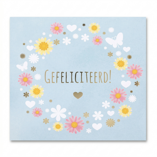 Deze lichtblauwe kaart heeft een krans van roze en gele bloemen op de voorkant. Binnenin klappen vrolijke bloemen met lachende gezichtjes omhoog uit het groene gras. Je hoort het nummer Celebration terwijl de lampjes feestelijk meeknipperen door de achtergrond. De kaart is 17 bij 17 centimeter groot en komt met een witte envelop. Het is een blijvende herinnering voor elke feestelijke dag.