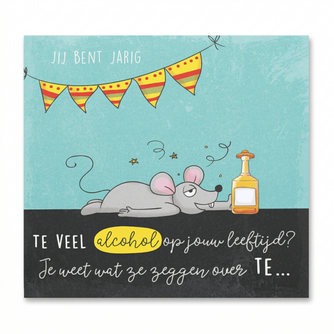 De turquoise kaart heeft een grappige tekening van een muis met een fles op de voorkant. Binnenin klappen er meerdere muizen omhoog die feestvieren met citroentjes en een grote fles. Terwijl de bekende melodie dertig seconden lang klinkt, branden de lichtjes vrolijk mee op de glinsterende achtergrond. De kaart is 17 bij 17 centimeter groot en komt met een witte envelop om je post netjes te versturen naar de jarige.