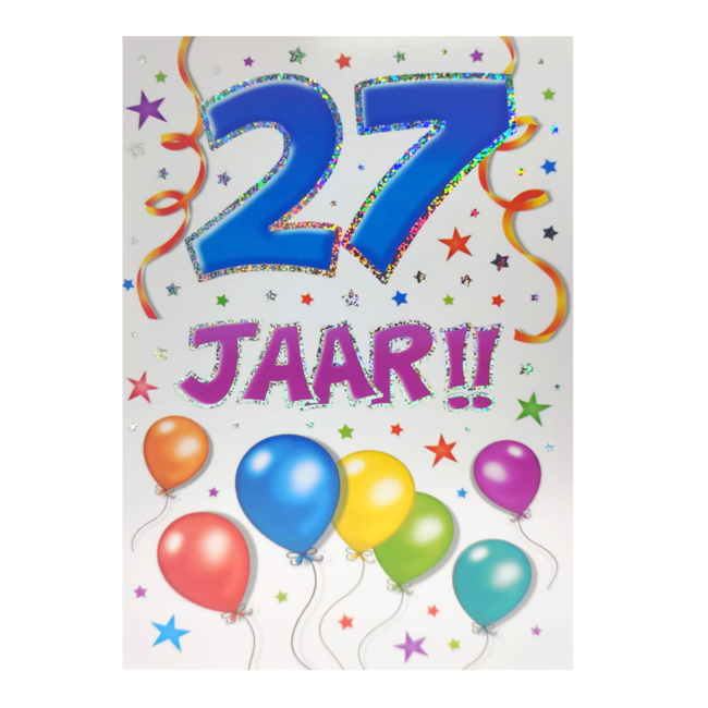 Een vrolijke en kleurrijke wenskaart van Artige met envelop, speciaal voor iemand die 27 JAAR!! wordt. Met ballonnen, sterren en glinsterende accenten is deze kaart een feestje op zich. Lees meer.