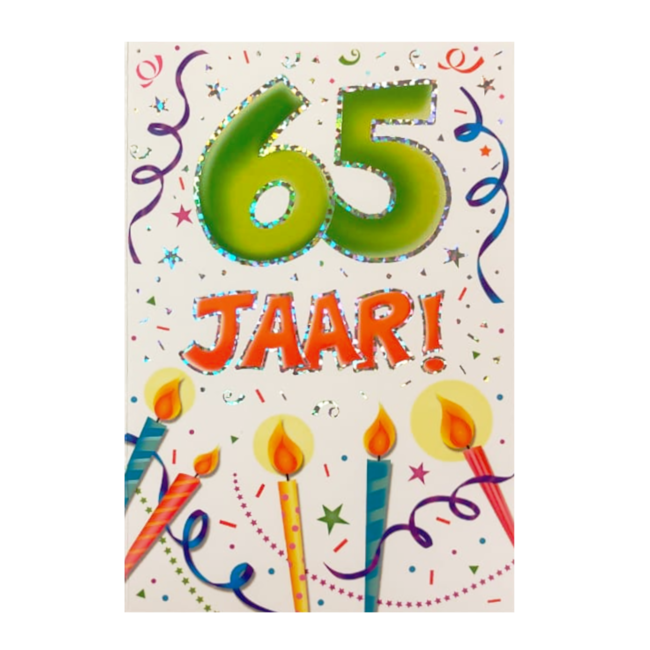 Een vrolijke en kleurrijke wenskaart voor een bijzondere mijlpaal. Deze 65 jaar kaart van Artige is perfect om iemand feestelijk te verrassen met een warme felicitatie en een glimlach.