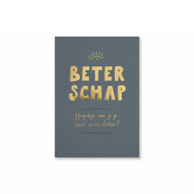 Deze dubbele wenskaart heeft een moderne donkergrijze kleur. De combinatie van de dikke gouden letters en de handgeschreven wens daaronder geeft de kaart een eigentijdse uitstraling. Boven de tekst staat een klein gouden zonnetje als lichtpuntje. De binnenkant is leeg voor je eigen bemoedigende woorden. Je krijgt er een passende envelop bij zodat je de post direct kunt versturen naar de zieke.