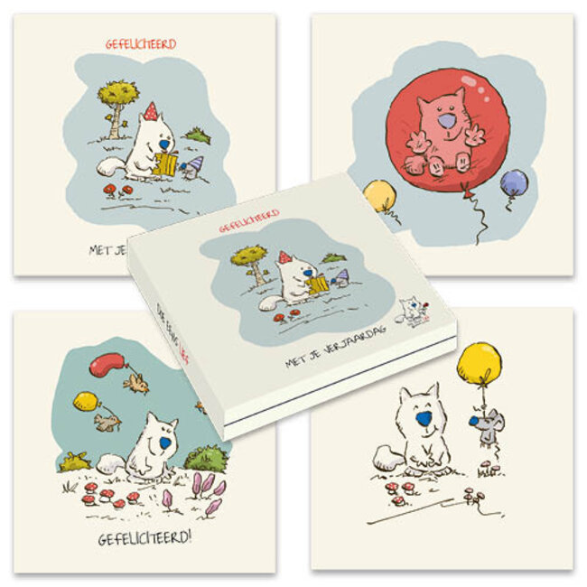 De kaarten hebben een handzaam vierkant formaat van elf bij elf centimeter en zitten samen in een stevig mapje. De tekeningen tonen een witte hond met een blauwe neus, feestelijke ballonnen en kleine muisjes. Teksten zoals gefeliciteerd en met je verjaardag staan al op de voorkant. Omdat de binnenkant leeg is heb je alle ruimte voor een eigen tekst aan de jarige job.
