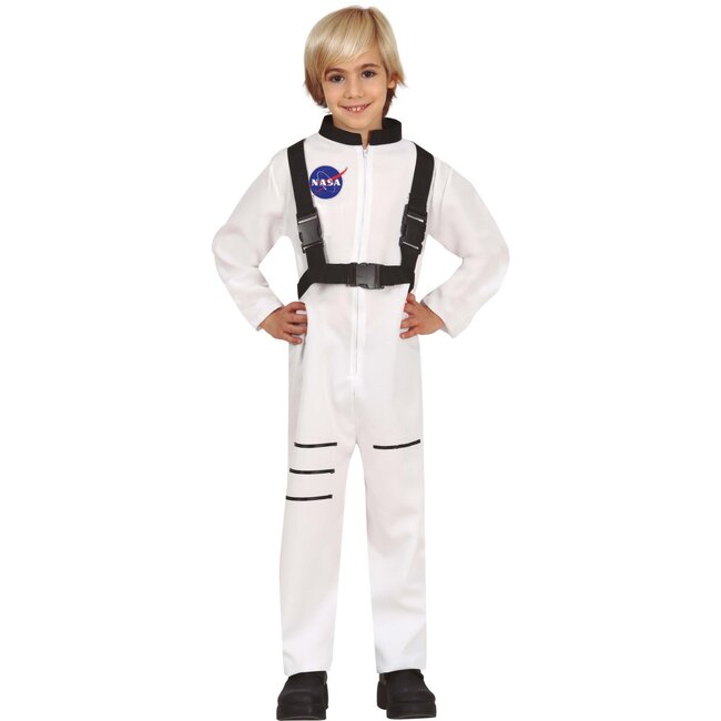 Dit kostuum bestaat uit een comfortabele witte overall uit één stuk. Op de borst is een cool logo van NASA te zien, waardoor het net lijkt alsof je echt bij de ruimtevaart hoort. Het pak is afgewerkt met stoere zwarte banden en gespen over de borst en zwarte accenten bij de enkels en kraag. Omdat het model unisex is, kunnen zowel jongens als meisjes zich verkleden als ruimtevaarder.