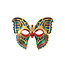 Dit masker heeft de sierlijke vorm van vlindervleugels. De gouden ondergrond glimt mooi in het licht en geeft een chique sfeer. Op de vleugels zie je kleurrijke patronen in rood, groen en blauw die het geheel opfleuren. Je kijkt makkelijk door de openingen voor de ogen. Dankzij het elastiek blijft het masker goed op zijn plek zitten terwijl je danst.