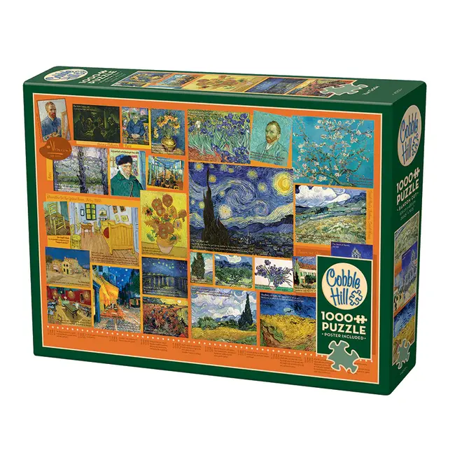 Op deze collage zie je beroemde doeken zoals de sterrennacht en de zonnebloemen. Naast de schilderijen staan teksten met korte uitleg over zijn werk en leven. De stukjes hebben allerlei gekke vormen waardoor je steeds weer goed moet kijken waar iets past. De achtergrond op de doos is warm oranje en de puzzel zelf zit vol blauwe en gele tinten. Je krijgt er een grote poster bij die je als voorbeeld kunt gebruiken.