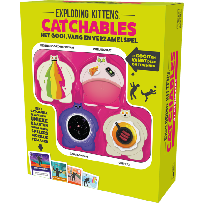 Exploding Kittens – Catchables is het hilarische gooi-, vang- en verzamelspel voor snelle handen en veel gelach. Gooi je Catchable in de lucht, voer gekke acties uit en vang hem weer op om punten te scoren!