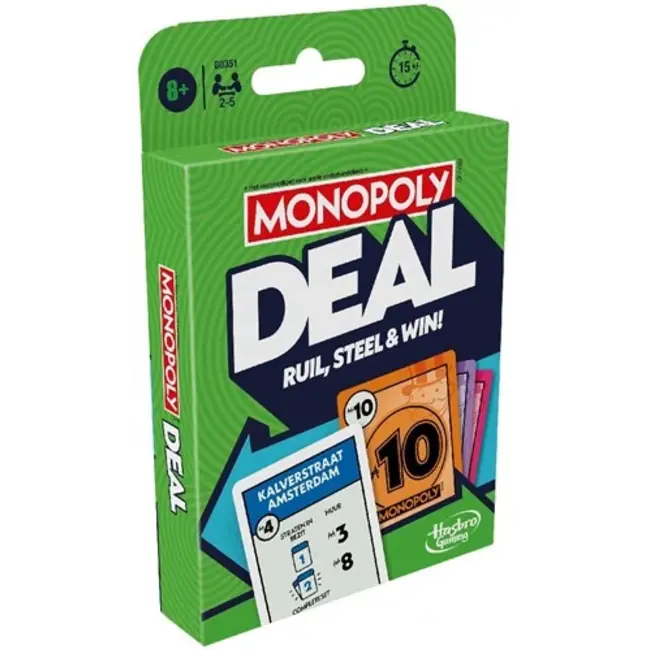 Met het Monopoly Deal kaartspel geniet je van de spanning van het bekende bordspel, maar dan in een vlot tempo. In deze vernieuwde editie verzamel je razendsnel straten en bezittingen om als eerste drie complete sets te bezitten en te winnen. Lees meer.