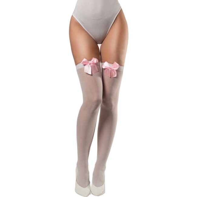 Deze witte stay-up kousen met roze strikjes van Partychimp zijn een speelse en elegante aanvulling op je outfit. Perfect voor themafeesten, verkleedkleding of speciale gelegenheden.