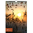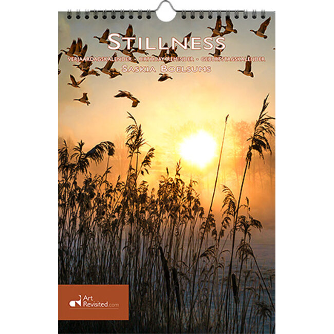 De kalender heeft een handige spiraal met een boogje, zodat je hem gemakkelijk aan de muur hangt. Op de voorkant zie je een warme, oranje zonsopkomst door het riet met vliegende ganzen. Elke maand toont een nieuw, sfeervol beeld van de kunstenares, alsof je naar een echt schilderij kijkt. Zo heb je alle verjaardagen van familie en vrienden op een overzichtelijke en mooie manier bij elkaar.
